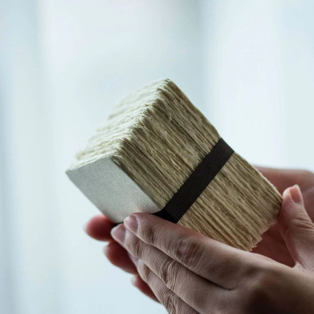 Conjunto com 100 cartões artesanais “Tesuki” espessos, acondicionados em caixa, com 4 bordas naturais (deckle). Produzidos a partir de fibra de kozo (amoreira), apresentam um delicado tom écru claro.